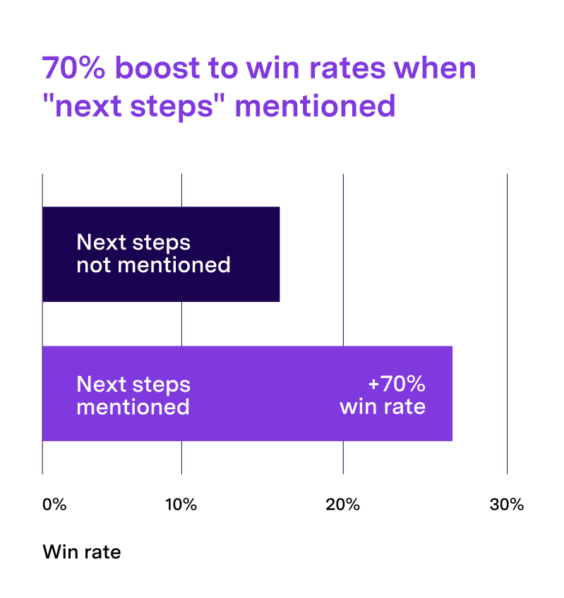 After combing through 300+ deal signals related to deal health in nearly 30k calls, we can say definitively that reps who discuss next steps at any point in a deal have a 70% higher chance of closing than reps who don’t: