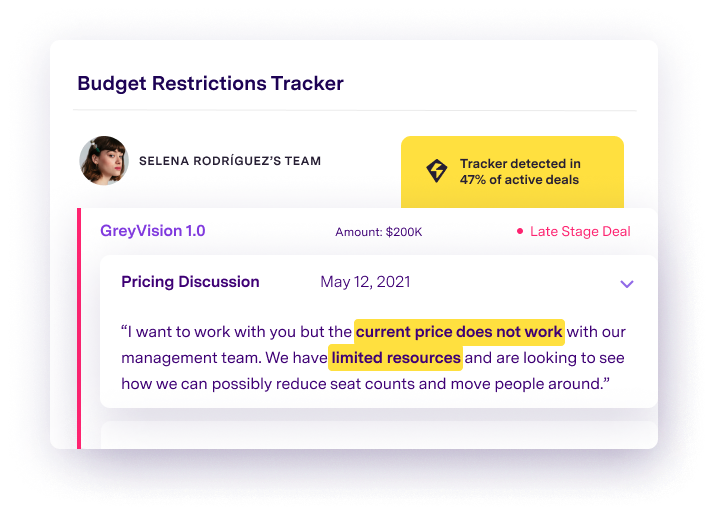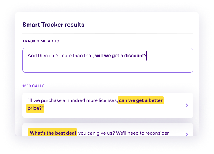 Uncover new ways customers communicate relevant topics using Gong Smart Trackers — the first user-trainable AI. Go beyond keyword recognition to understand the context of all customer interactions.