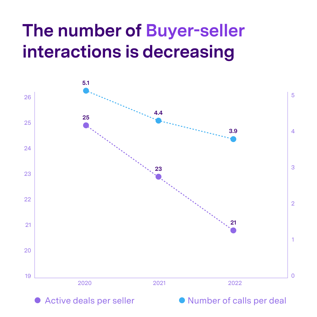 Our data showed that this decrease in seller interactions was two-fold. In 2022, sales reps had fewer active deals that they were working, while the average number of meetings/calls per deal had also decreased. Factoring both, on average, reps saw a 36% decrease in the total number of interactions with buyers compared to 2020.