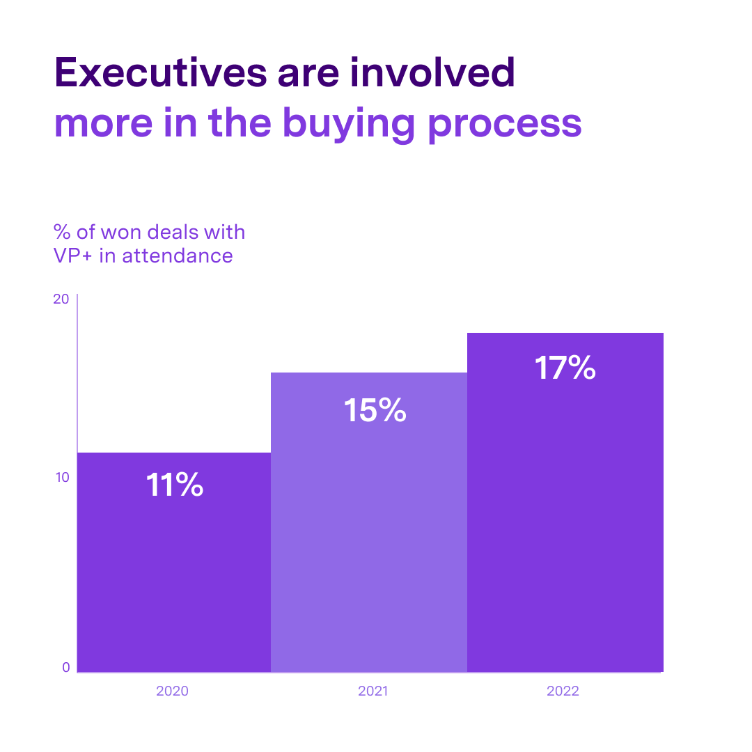 In 2023, executives became more involved in the buying process. Since 2020, we’ve seen a 55% increase in the number of won deals where VP+ personas participated in one or more sales meetings.