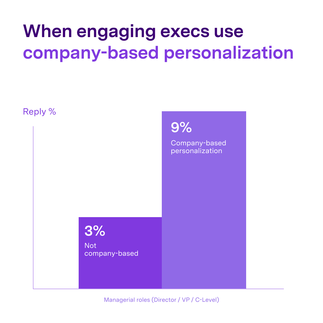With execs getting more involved in deals, understanding how to get them engaged is critical. This includes using the right approach to email personalization. Our data shows that company-based personalization boosts replies from people who are higher up the org chart.