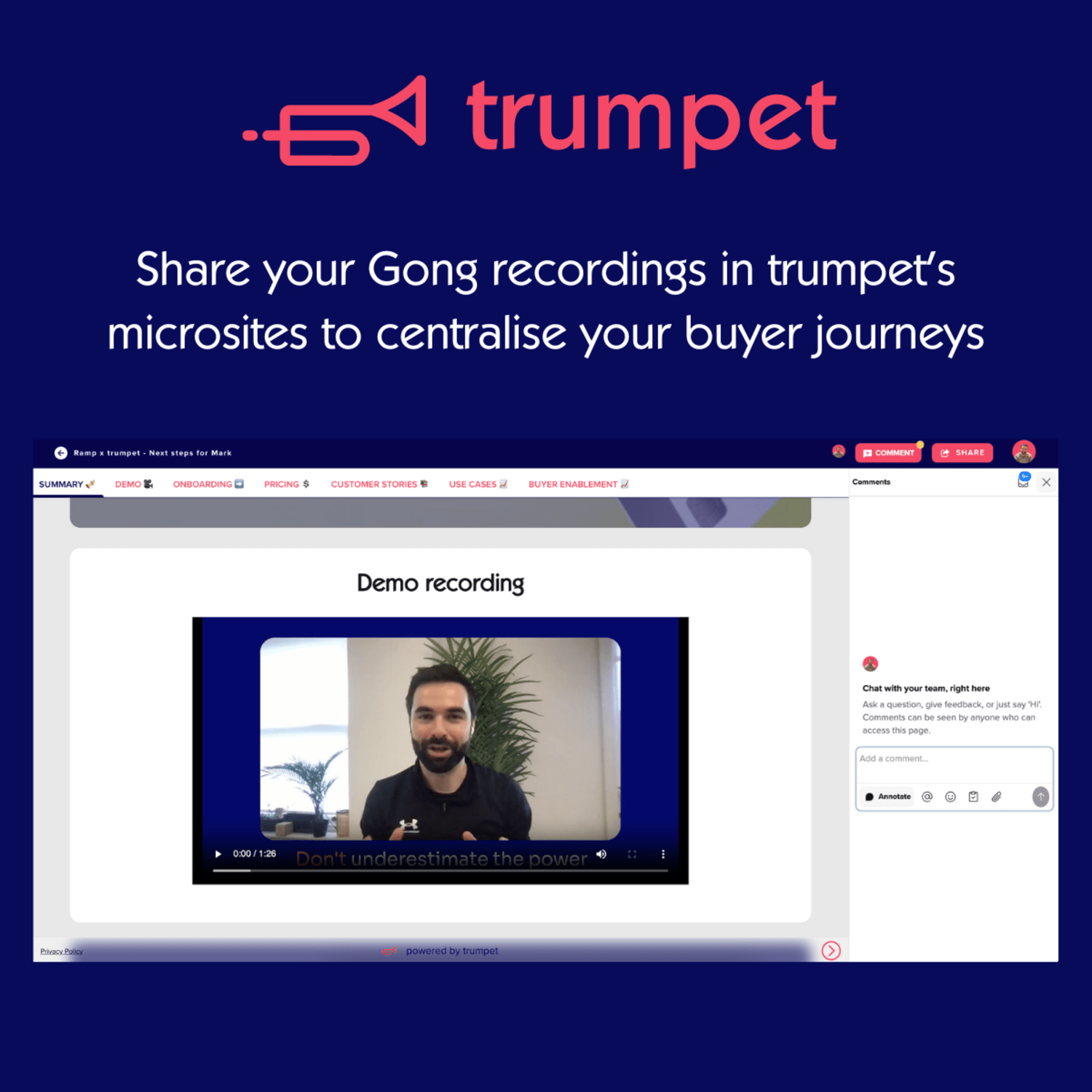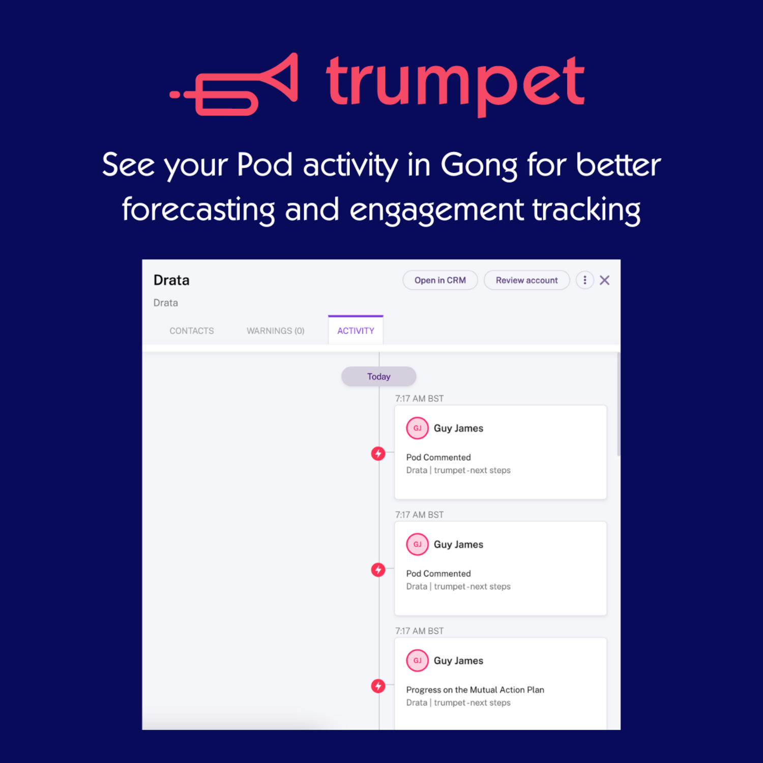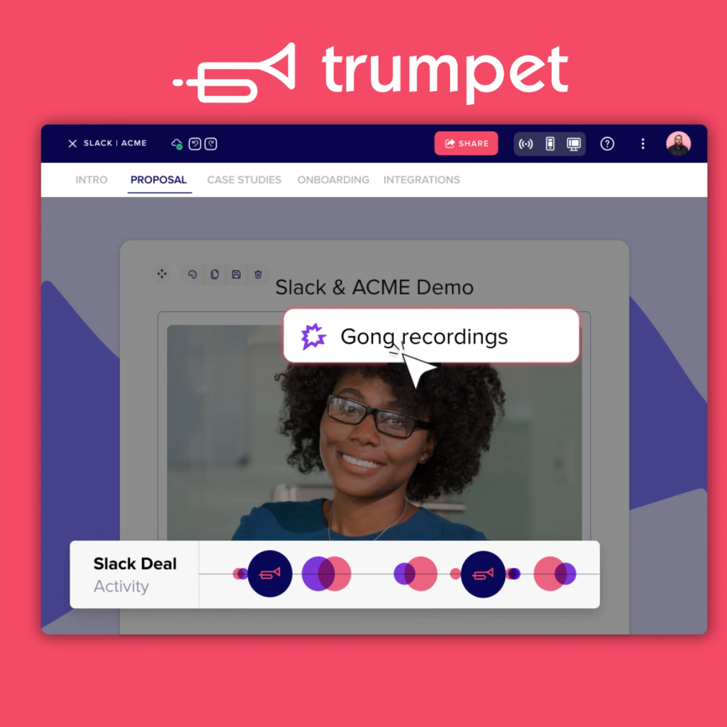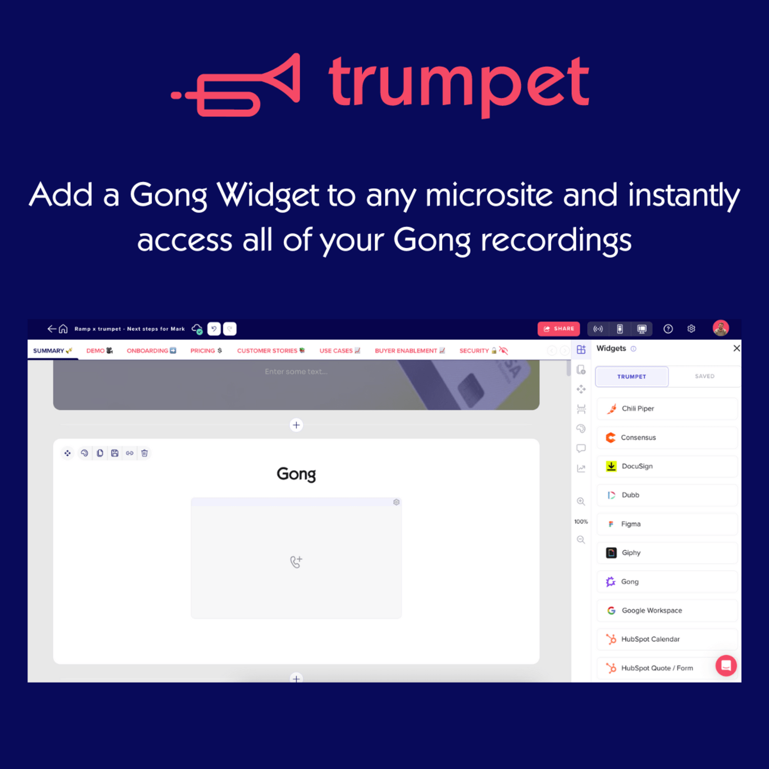 - Once connected, you’ll be able to add the Gong Widget and any Gong Recordings to your trumpet